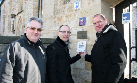 André Kuper und Gisela Nagel enthüllen die Plakette der GEDG