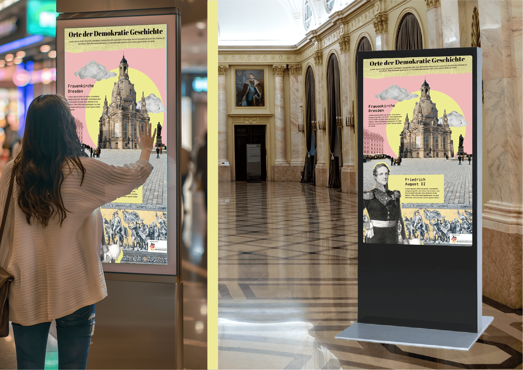 „Standpunkte: Demokratie“ ist ein Projekt, das Dresdens historische Orte der Demokratie lebendig macht. Mithilfe interaktiver und gemeinsam mit kreativen, jungen Dresdnerinnen und Dresdnern entwickelten Inhalten, gestalten wir eine digitale Ausstellung, die das Thema Meinungsfreiheit mit Orten der Demokratiegeschichte in Zusammenhang bringt. In Einkaufszentren, Bibliotheken oder Kinos sensibilisieren sie für den Schutz freier Meinungsäußerung und machen sie auf die Orte in ihrer Umgebung aufmerksam.