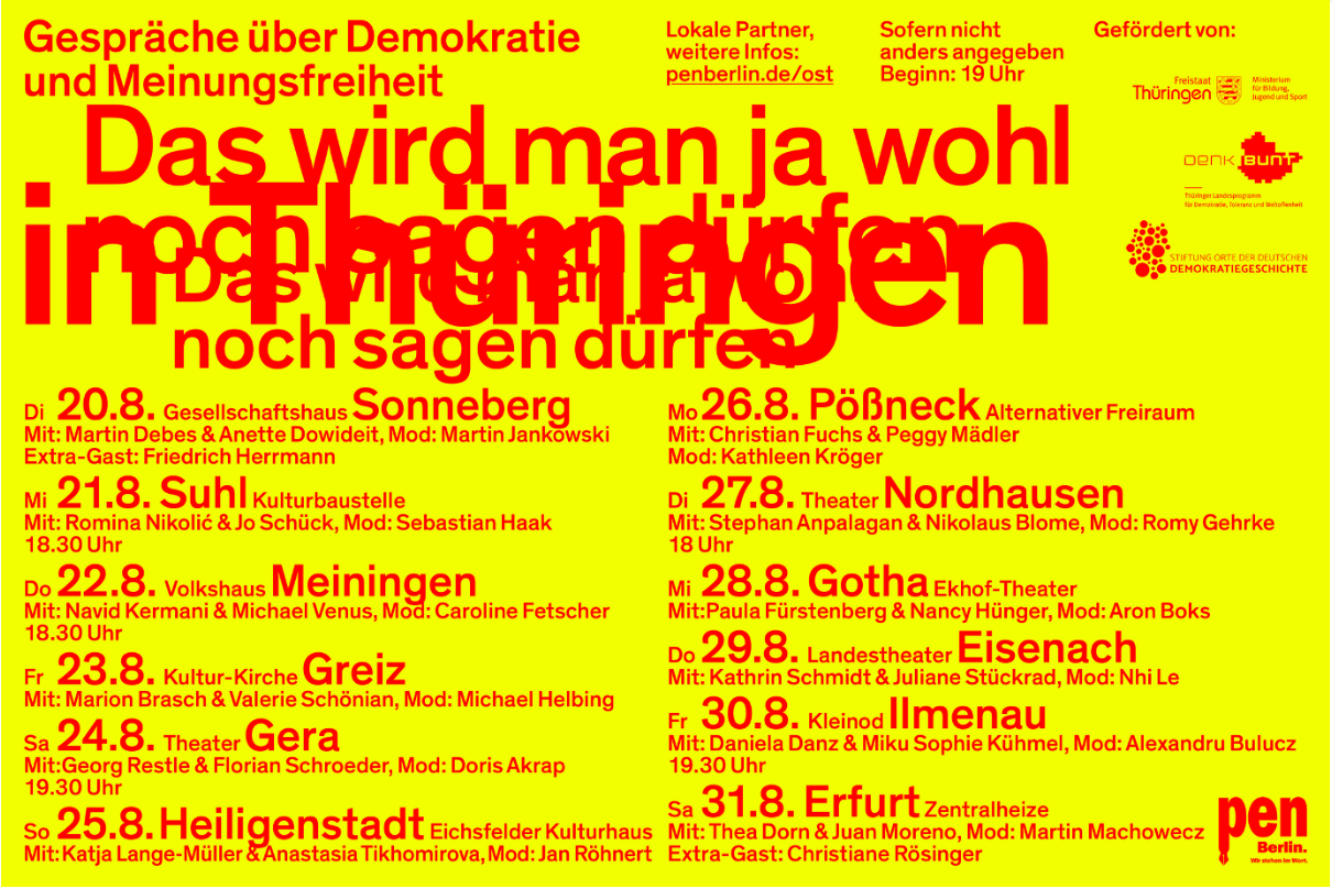 Unter dem Titel »Das wird man ja wohl noch sagen dürfen – Meinungsfreiheit und Demokratie« organisiert PEN Berlin eine Gesprächsreihe in Sachsen, Thüringen und Brandenburg: 37 Veranstaltungen, von Annaberg bis Perleberg, von Ilmenau bis Zwickau, mit 118 mitwirkenden Schriftstellerinnen und Schriftstellern, Journalistinnen und Journalisten, Publizistinnen und Publizisten, Künstlerinnen und Künstlern: von Pinar Atalay bis Juli Zeh, von Dirk Oschmann bis Monika Maron.