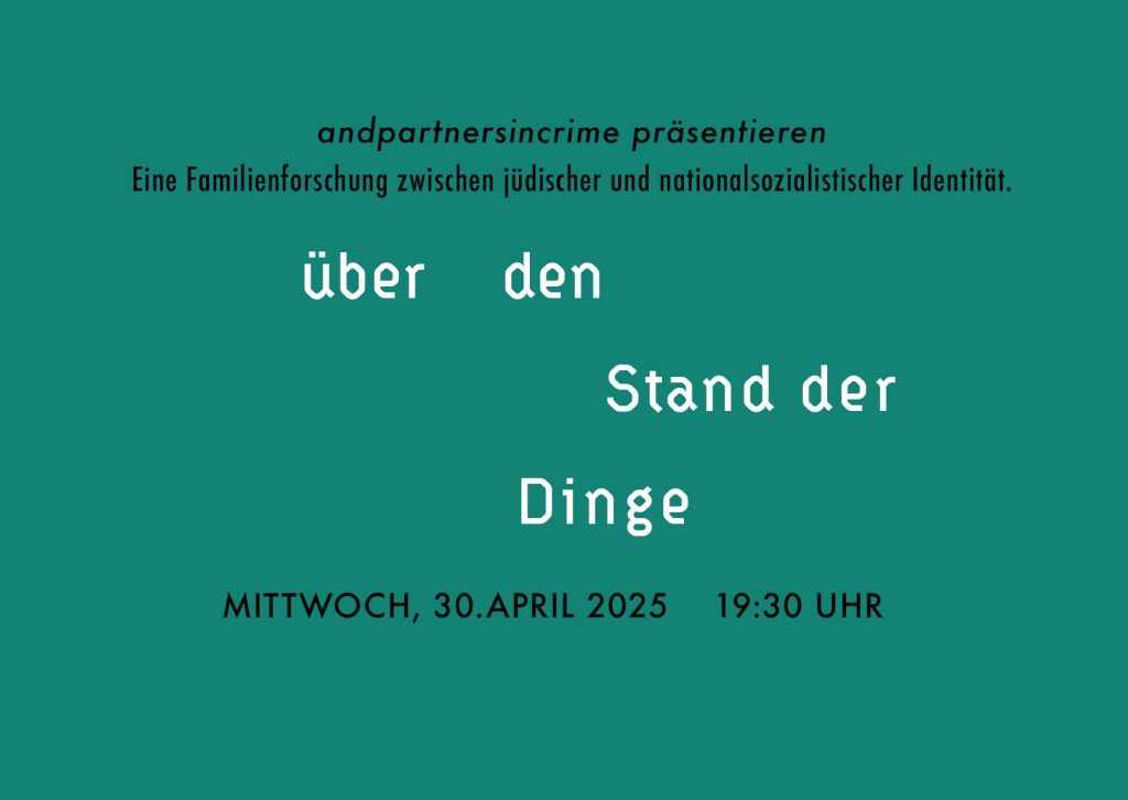 Eleonora L. Herder von andpartnersincrime, einem internationalen Kollektiv freischaffender Performancekünstler:innen mit Sitz in Frankfurt am Main, hat sich auf die Suche nach den verschwiegenen Echos ihrer Familienvergangenheit gemacht. Über zehn Jahre lang hat sie Dokumente und Objekte aus privaten und öffentlichen Archiven zusammengetragen und gesichtet. Ihre bisherigen Funde erzählen eine neue Geschichte deutsch-jüdischer Identität, in dem die Grenzen zwischen Politischem und Privatem, zwischen Opfer- und Täterrolle verschwimmen. Die darin verwobenen Biografien eröffnen eine ganz eigene Lebenslinie innerhalb der historischen Ereignisse des Nationalsozialismus.