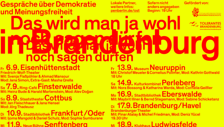 Unter dem Titel »Das wird man ja wohl noch sagen dürfen – Meinungsfreiheit und Demokratie« organisiert PEN Berlin eine Gesprächsreihe in Sachsen, Thüringen und Brandenburg: 37 Veranstaltungen, von Annaberg bis Perleberg, von Ilmenau bis Zwickau, mit 118 mitwirkenden Schriftsteller:innen und Journalist:innen, Publizist:innen und Künstler:innen von Pinar Atalay bis Juli Zeh, von Dirk Oschmann bis Monika Maron.