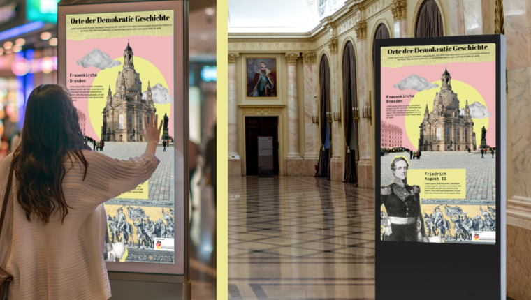 „Standpunkte: Demokratie“ ist ein Projekt, das Dresdens historische Orte der Demokratie lebendig macht. Mithilfe interaktiver und gemeinsam mit kreativen, jungen Dresdnerinnen und Dresdner entwickelten Inhalten, gestalten wir eine digitale Ausstellung, die das Thema Meinungsfreiheit mit Orten der Demokratiegeschichte in Zusammenhang bringt. In Einkaufszentren, Bibliotheken oder Kinos sensibilisieren sie für den Schutz freier Meinungsäußerung und machen sie auf die Orte in ihrer Umgebung aufmerksam.