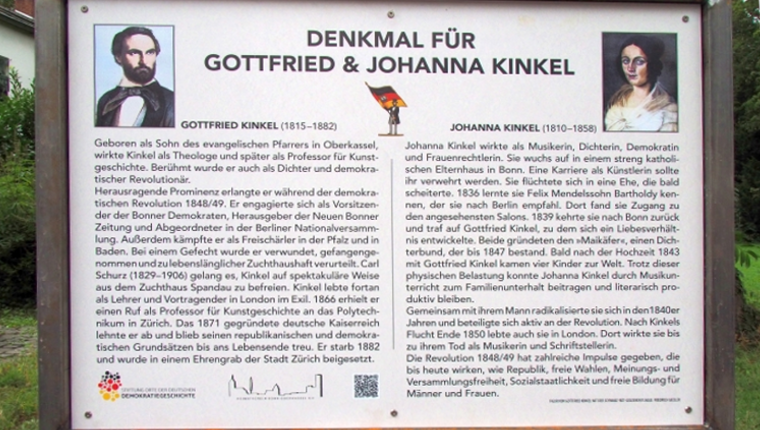 Das Denkmal des demokratischen Revolutionärs und Dichters Gottfried Kinkel (1815-1882) in Bonn-Oberkassel wurde im Mai 2022 geschändet. Vier Bronzerelieftafeln wurden gestohlen. Das Projekt des Heimatvereins Bonn-Oberkassel verfolgt die Ziele: 1. Nachbildung der Bronzeplatten. 2. Installation einer Zusatztafel, die auf Gottfried und Johanna Kinkels Rolle während der Revolution 1848 und ihre Bedeutung für die Demokratiegeschichte hinweist. 3. Integration des Denkmals in einen Weg der frühen rheinischen Demokratie. 4. Wiederherstellung der Exedra, die um 1960 aufgeschüttet worden ist.