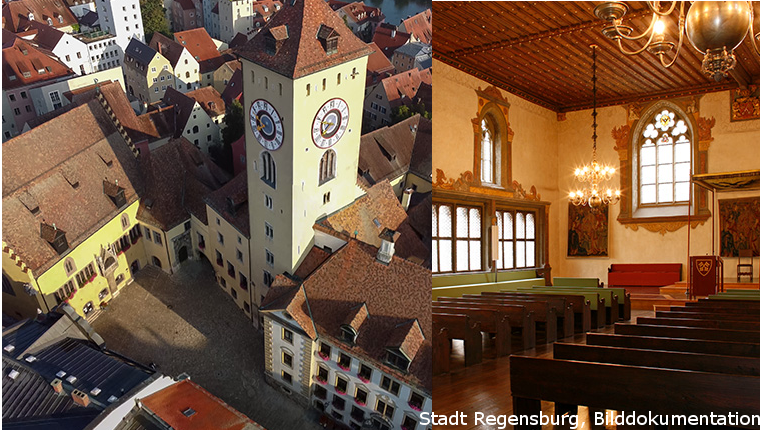 Friedrich II. bestätigte Regensburg 1245 eine kommunale Selbstverwaltung. Reichstage, Versammlungen der Herrschaftsträger des Reichs, fanden hier häufig statt. Der Immerwährende Reichstag tagte von 1663 bis 1806. Eine webbasierte App stellt die Abstimmungsverfahren nach Räumen vor: Die Reichsstände berieten getrennt als Kurfürsten, geistliche und weltliche Fürsten und Städte bzw. nach Religionszughörigkeit, um sich dann im Reichssaal zum Beschluss unter dem Vorsitz des Kaisers einzufinden.