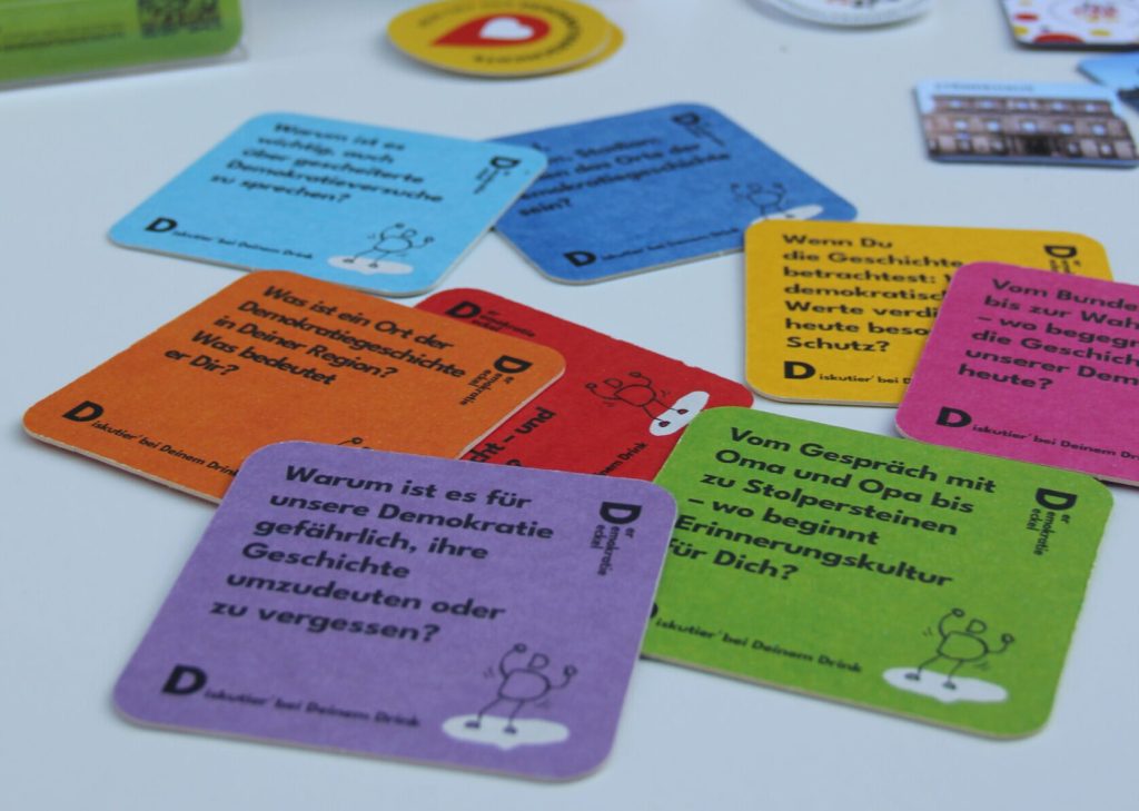 Gemeinsam mit dem Verein Demokratiedeckel e. V. haben wir eine Sonderedition der Demokratiedeckel entwickelt. Jedes Set enthält acht Bierdeckel, die mit Fragen rund um die deutsche Demokratiegeschichte bedruckt sind.