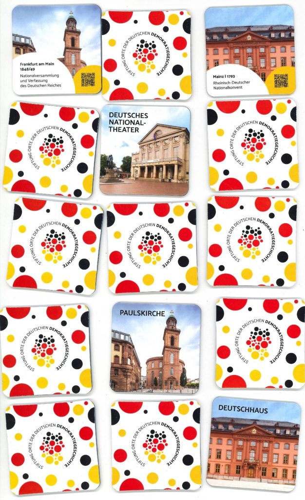 Mit unserem Verfassungs-Memory wird Geschichte zum Puzzle, das sich spielend zusammensetzen lässt. Die Karten zeigen 18 prägende Orte der deutschen Verfassungsgeschichte – von der Paulskirche in Frankfurt bis zum Bundesverfassungsgericht in Karlsruhe, vom Hambacher Schloss bis zur Nikolaikirche in Leipzig.